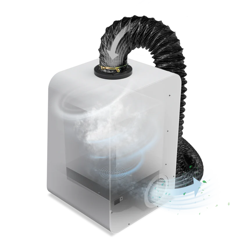 Dodatkowym atutem jest system “Catch Fumes at the Source”. Dzięki elastycznemu wężowi o długości 2 metrów i średnicy 75 mm, podłączasz oczyszczacz bezpośrednio do obudowy drukarki. Tworzy to zamknięty obieg powietrza, który zapobiega wyciekom zapachów i oparów na zewnątrz 24 godziny na dobę, 7 dni w tygodniu.