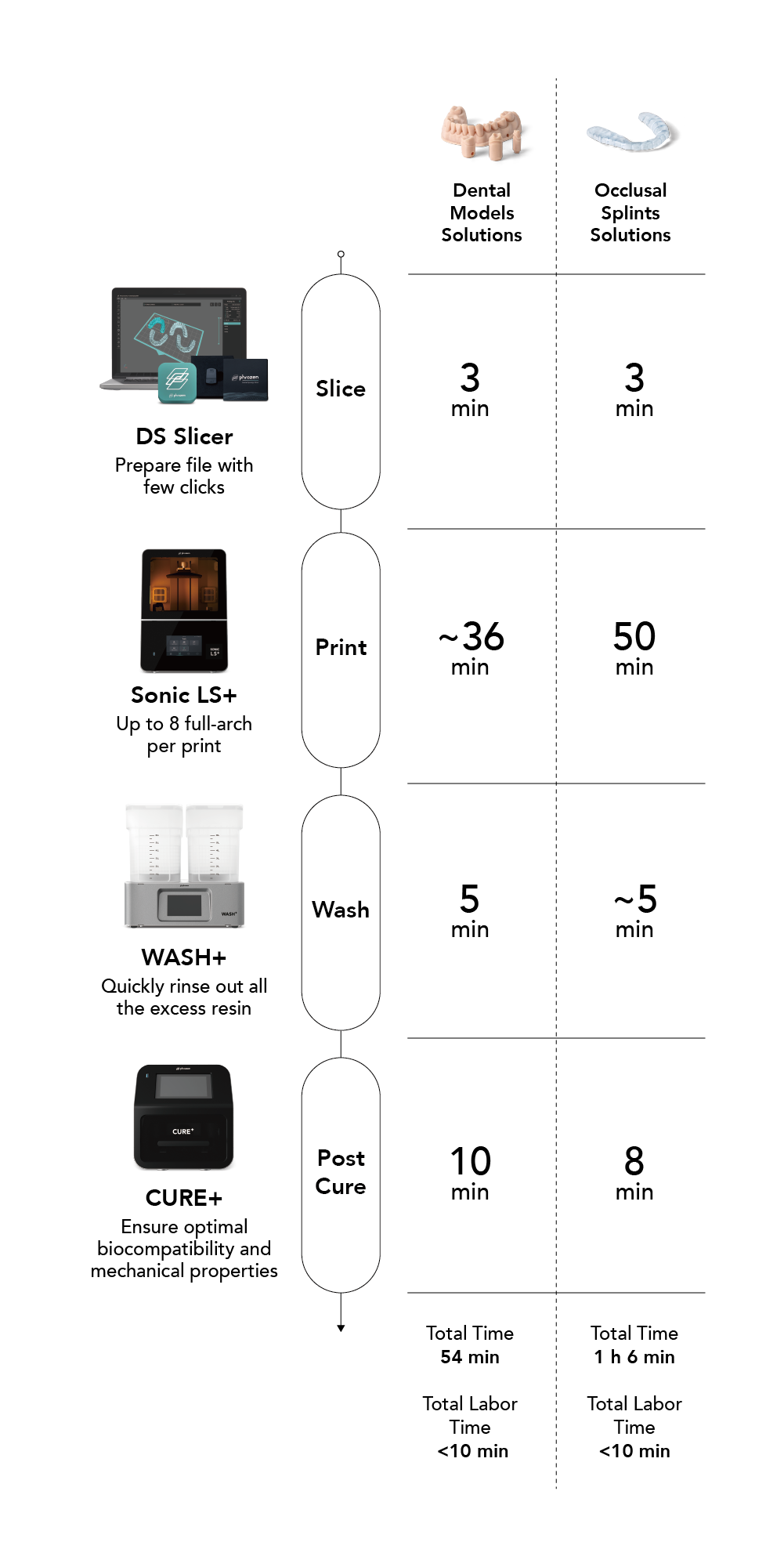 | Przykładowe czasy | Szablon chirurgiczny około 5 min; Korony i mosty około 11 min; Szyna około 10 min* |